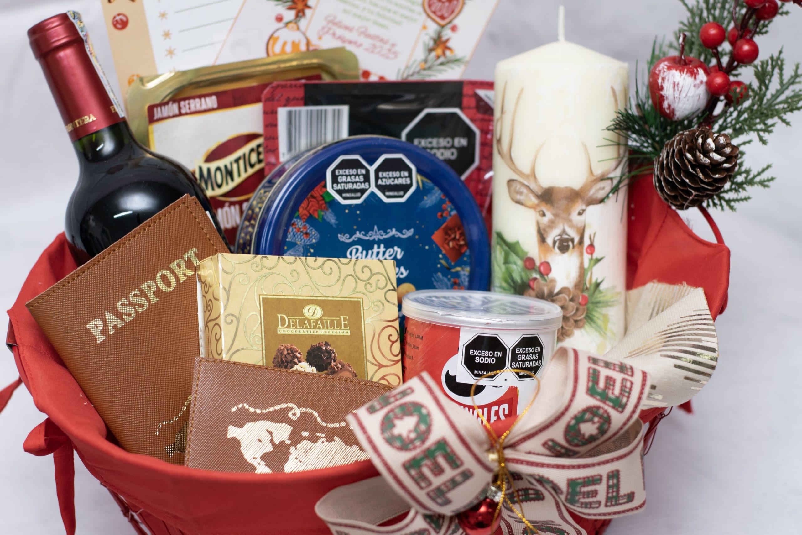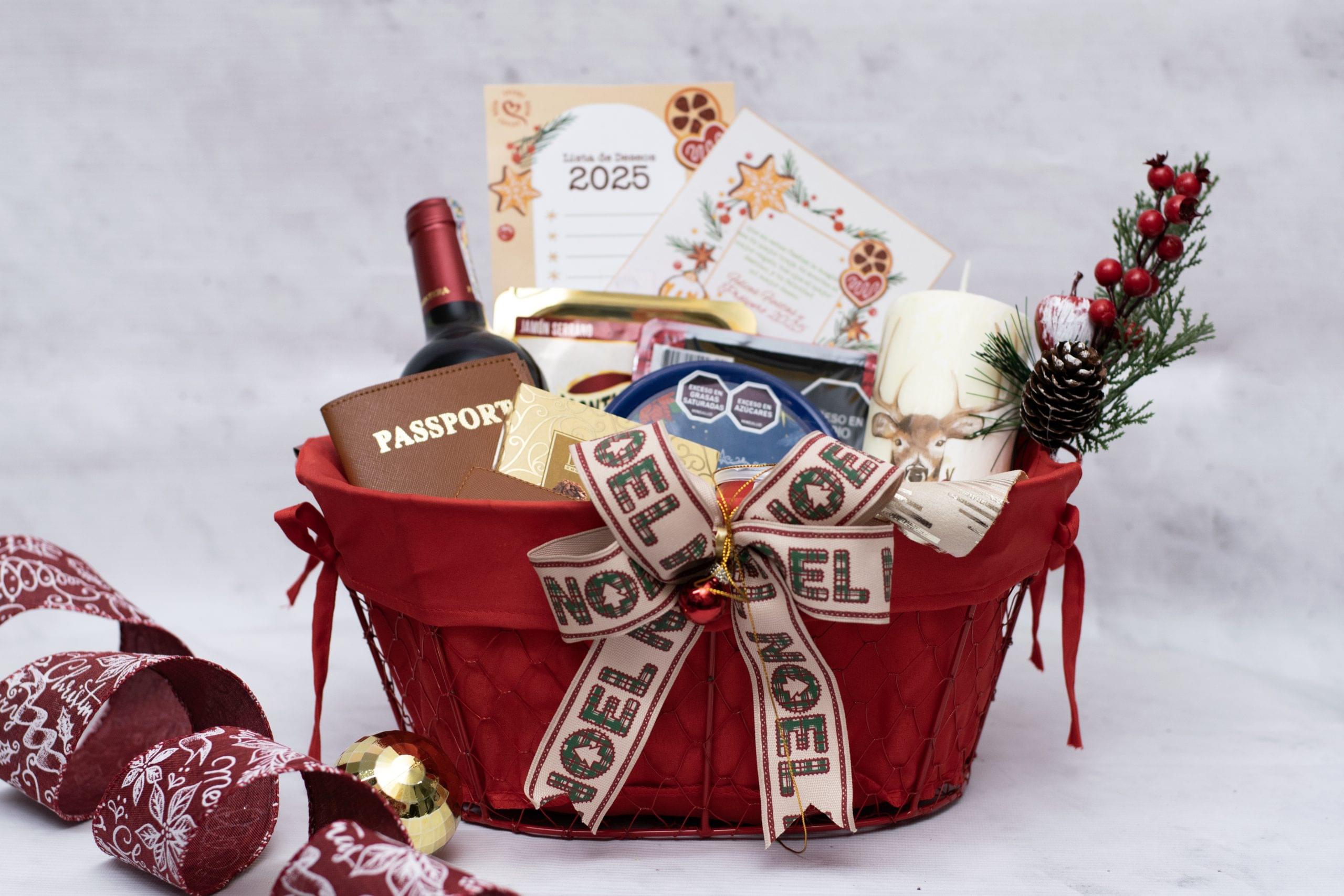 Canasta Metálica roja forrada en tela, con lazo navideño y pin navideño según disponibilidad